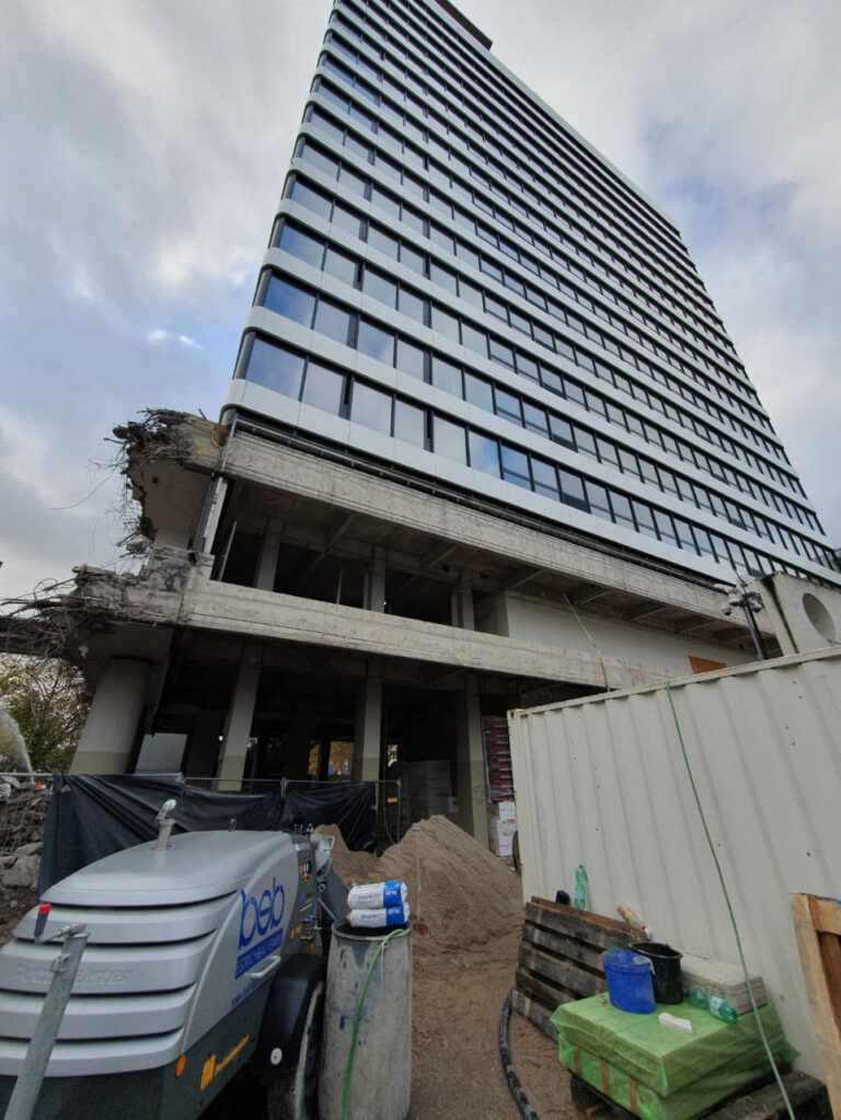 The team was instructed in the new machine on a construction site in Bielefeld, where the first opportunity for the Mixokret to demonstrate its power was pumping cement screed up to the 18th floor of a new building.